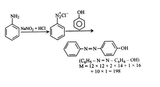 9.3 g of pure aniline upon diazotisation followed by coupling with phenol gives an orange dye. The mass of orange dye produced (assume 100% yield/conversion) is _______ g. (nearest integer) [2024]