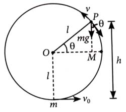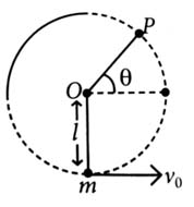 A bob of heavy mass is suspended by a light string of length . The bob is given a horizontal velocity as shown in the figure. If the string gets slack at some point P making an angle from the horizontal, the ratio of the speed of the bob at point P to its initial speed is [2025]