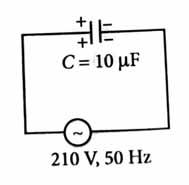 A 10 μF capacitor is connected to a 210 V, 50 Hz source as shown in figure. The peak current in the circuit is nearly (π = 3.14) [2024]
