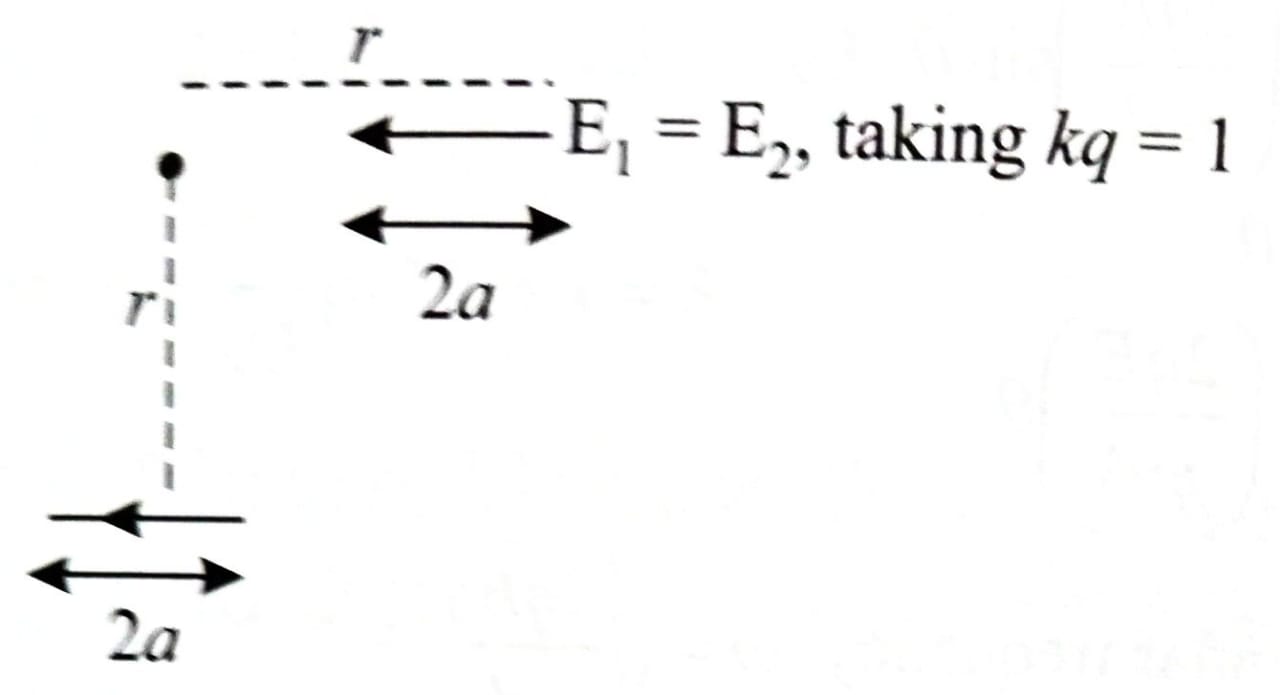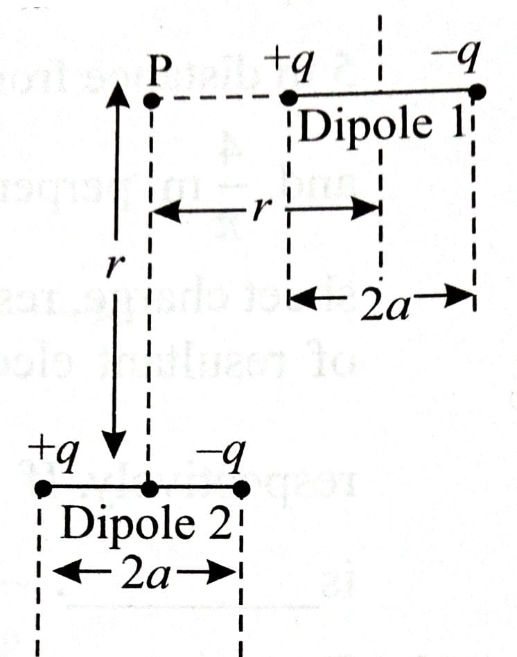A point particle of charge Q is located at P along the axis of an electric dipole 1 at a distance r as shown in the figure. The point P is also on the equatorial plane of a second electric dipole 2 at a distance r. The dipoles are made of opposite charge q separated by a distance 2a. For the charge particle at P not to experience any net force, which of the following correctly describes the situation [2025]
