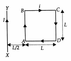 A square loop carrying a current , is placed near and coplanar with a long straight conductor carrying a current , the net force on the loop will be [2016]