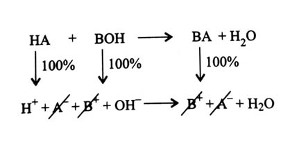 When a monobasic strong acid reacts with a monoacidic strong base, then net reaction is combination of one mol with one mole to form one mole of water as shown below: