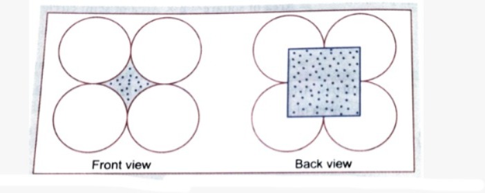 Pragati made a paper flower using 4 identical circles and a dotted square. The front view and back view of the flower is as shown below.