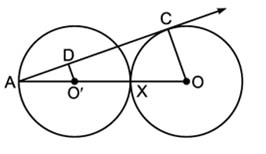 In the below figure, two equal circles, with centres O and O', touch each other at X. OO' produced meets the circle with centre O' at A. AC is tangent to the circle with centre O, at the point C. O'D is perpendicular to AC. Find the value of .