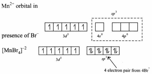 For coordination number 4 as in given complex, possible shapes are square planar (with hybridization) or tetrahedral (with hybridization). For hybridization, electrons in 3d orbital need to pair up to make one d orbital vacant. But since bromide is a weak field ligand, it cannot cause pairing.