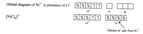 Cl- is a weak field ligand; hence does not cause pairing of 3d8 electrons. Ni2+ undergoes sp3 hybridization and lone pairs from Cl- are accommodated in sp3 orbitals.