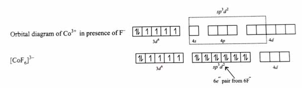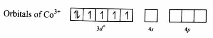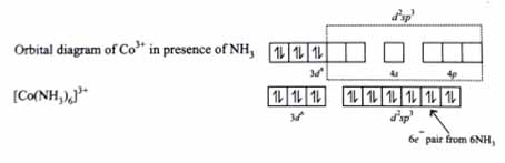 NH3 is a strong field ligand. It pairs up d electrons. After pairing d electrons, two 3d orbitals are vacant. Co3+ undergoes d2sp3 hybridization by using two 3d orbitals. Six e- pairs from six NH3 are accommodated in these six d2sp3 orbitals.
