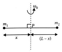 Point masses and are placed at the opposite ends of a rigid rod of length L, and negligible mass. The rod is to be set rotating about an axis perpendicular to it. The position of point P on this rod through which the axis should pass so that the work required to set the rod rotating with angular velocity is minimum, is given by [2015]