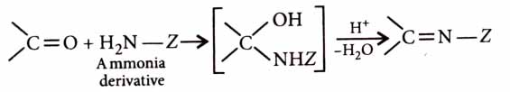 Carbonyl compounds react with ammonia derivatives in weakly acidic medium as follows: