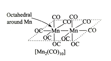 The coordination geometry around the manganese in decacarbonyldimanganese (0)