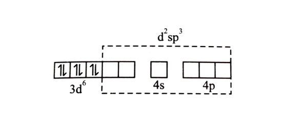 is a strong field ligand. It pairs up d electrons. After pairing d electrons, two 3d orbitals are vacant. undergoes hybridization by using two 3d orbitals. Six pairs from six are accommodated in these six orbitals.