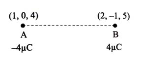 Two charges of -4μC and +4μC are placed at the points A(1,0,4)m and B(2,−1,5)m located in an electric field E→=0.20i^V/cm. The magnitude of the torque acting on the dipole is 8α×10-5Nm, where α = _________. [2024]