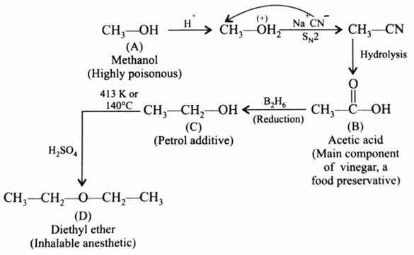 A toxic compound “A” when reacted with NaCN in aqueous acidic medium yields an edible cooking component and food preservative ‘B’. ‘B’ is converted to ‘C’ by diborane and can be used as an additive to petrol to reduce emission. “C” upon reaction with oleum at 140°C yields an inhalable anesthetic “D”. Identify “A”, “B”, “C” and “D”, respectively. [2025]