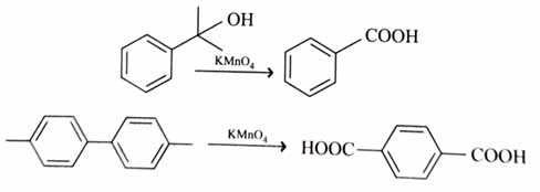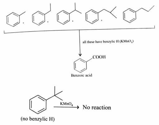 According to NTA following five compounds give benzoic acid upon oxidation with , because presence of a benzylic hydrogen is necessary for oxidation of side chain to –COOH.