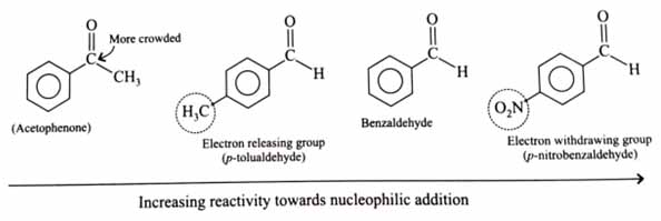 Lesser is crowding around C=O and more is partial positive charge on carbon of C=O, more is reactivity of carbonyl compounds towards nucleophilic addition. Electron withdrawing groups increase partial positive charge and electron releasing groups decrease partial positive charge on C=O.