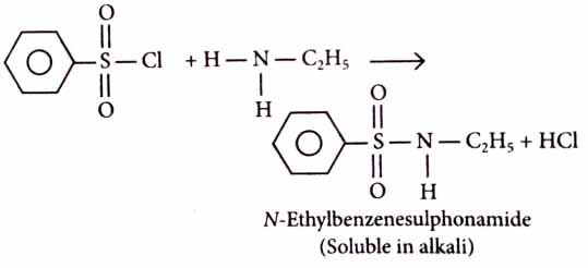 Benzene sulphonyl chloride , which is also known as Hinsberg’s reagent, reacts with primary amines to form sulphonamides. The hydrogen attached to nitrogen in sulphonamide is strongly acidic due to the presence of strong electron withdrawing sulphonyl group. Hence, it is soluble in alkali.