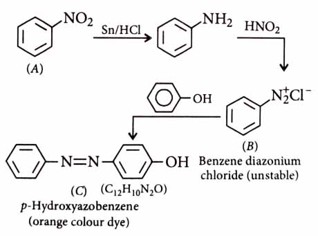A given nitrogen-containing aromatic compound ‘A’ reacts with Sn/HCl, followed by to give an unstable compound ‘B’. ‘B’, on treatment with phenol, forms a beautiful coloured compound ‘C’ with the molecular formula . The structure of compound ‘A’ is [2016]