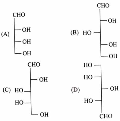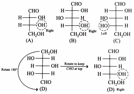 In Fischer structure keep the most oxidized carbon (i.e. CHO in given question) at top and all the carbons on vertical line. Now if OH of last chiral carbon is to the right, the compound is said to have ‘D’ configuration. Compounds A, B and D have ‘D’ configuration.