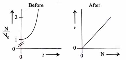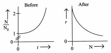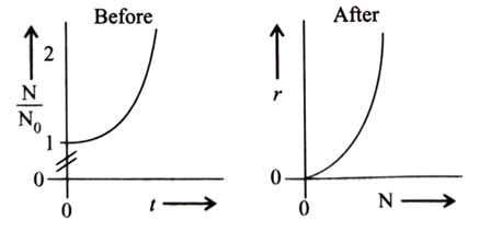 A person’s wound was exposed to some bacteria and then bacterial growth started to happen at the same place. The wound was later treated with some antibacterial medicine and the rate of bacterial decay (r) was found to be proportional with the square of the existing number of bacteria at any instance. Which of the following set of graphs correctly represents the ‘before’ and ‘after’ situation of the application of the medicine?