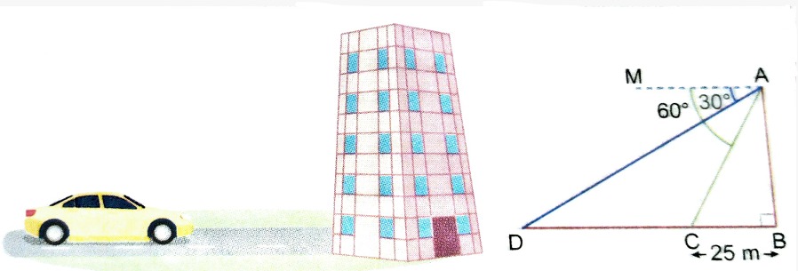 Rohit is standing at the top of a building and observes a car at an angle of depression of as it approaches the base of the building at a uniform speed. 6 seconds later, the angle of depression increases to , and at that moment, the car is 25 m away from the building.