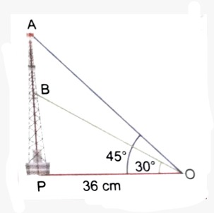 Distance between the base of the tower and point O is 36 cm. From point O, the angle of elevation of the top of section B is and the angle of elevation of the top of section A is