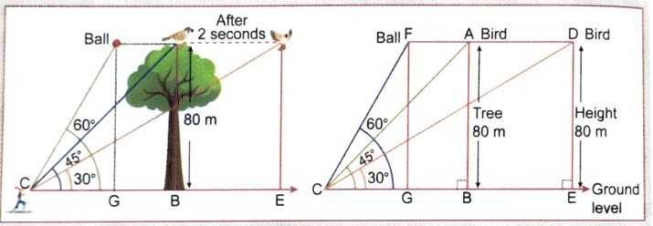 When a sixer was hit, the ball flew through the tree, scaring the bird away. 2 seconds later, Kaushik noticed that the bird was flying at the same height but at an angle of elevation of . Meanwhile, the ball was also flying towards him at the same height with an angle of elevation of .