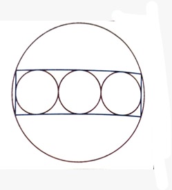 In the given figure, the centre of all three circles of equal radius = 10 cm lie in a straight line. These circles are inscribed in a rectangle which is inscribed in another circle.