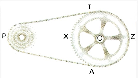 The chain and gears of bicycles or motorcycles, as well as the belt around pulleys, are real-life examples of tangents to a circle. One such example is shown in Fig, where PI and PA represent tangents to the gears of a bicycle.