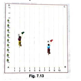 In order to conduct Sports Day activities in your School, lines have been drawn with chalk powder at a distance of 1 m each, in a rectangular shaped ground ABCD. 100 flowerpots have been placed at a distance of 1 m from each other along AD as shown in the given figure below.