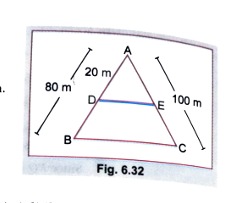 (i) If the point D is 20 m away from point A, whereas AB and AC are 80 m and 100 m respectively, find the length of AE.