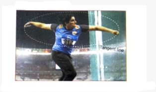 The discus throw is an event in which an athlete aims to throw a discus as far as possible. The athlete spins counterclockwise one and a half times within a circle before releasing the discus. Upon release, the discus travels along a tangent to the circular path of the spin.
