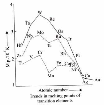 In any row the melting points of these metals rise to a maximum at except for anomalous values of Mn and Tc and fall regularly as the atomic number increases. The maxima at about the middle of each series indicate that one unpaired electron per orbital is particularly favourable for strong interatomic interaction. In general, greater the number of valence electrons, stronger is the resultant bonding. Because of stable half filled configurations, Mn and Tc have lesser tendency to participate in metallic bonding, hence have lower melting points than expected value.