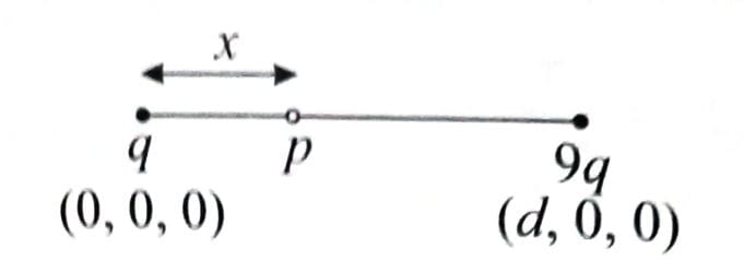 A point charge +q is placed at the origin. A second point charge +9q is placed at (d, 0, 0) in Cartesian coordinate system. The point in between them where the electric field vanishes is: [2025]
