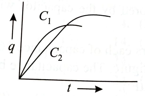 Two capacitors and are connected in parallel to a battery. Charge-time graph is shown below for the two capacitors. The energy stored with them are and , respectively. Which of the given statements is true? [2025]
