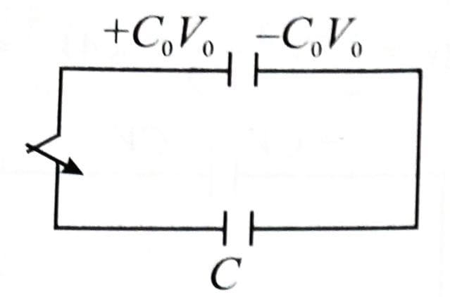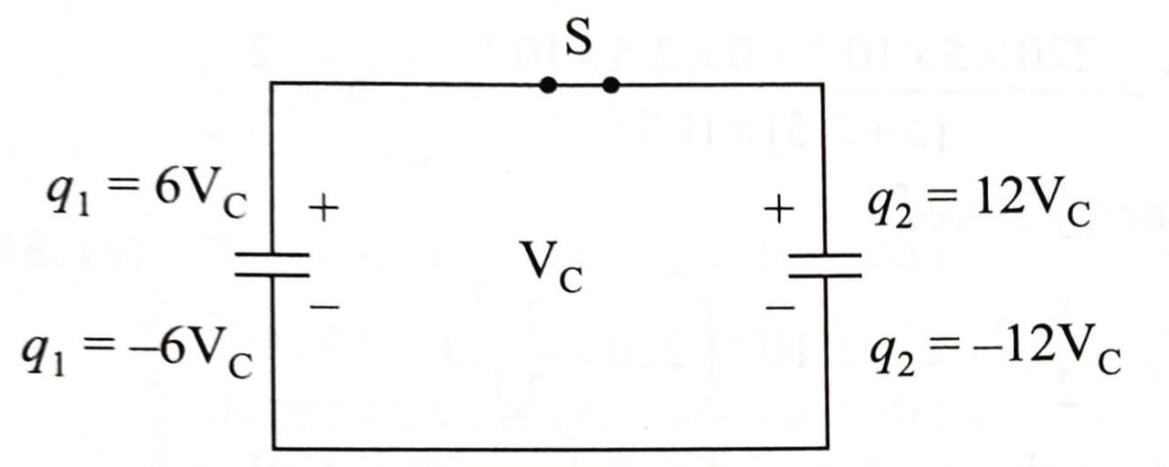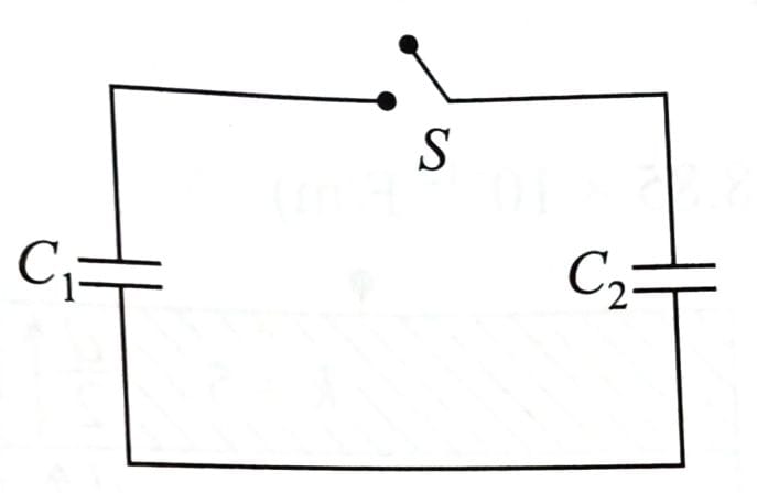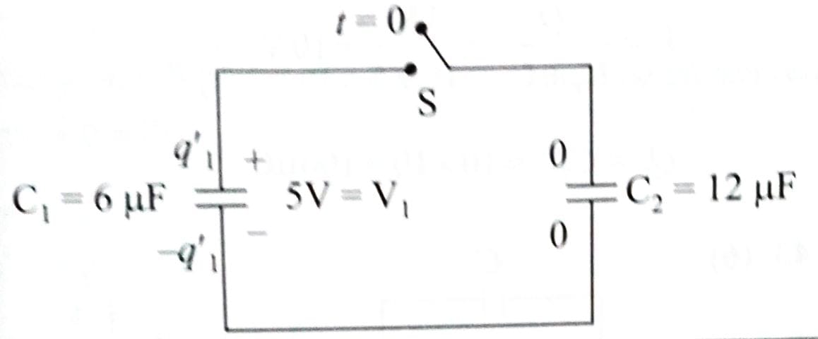 A capacitor, is charged to a potential difference of 5 V using a 5 V battery. The battery is removed and another capacitor, is inserted in place of the battery. When the switch 'S' is closed, the charge flows between the capacitors for some time until equilibrium condition is reached. What are the charges ( and ) on the capacitors and when equilibrium condition is reached? [2025]