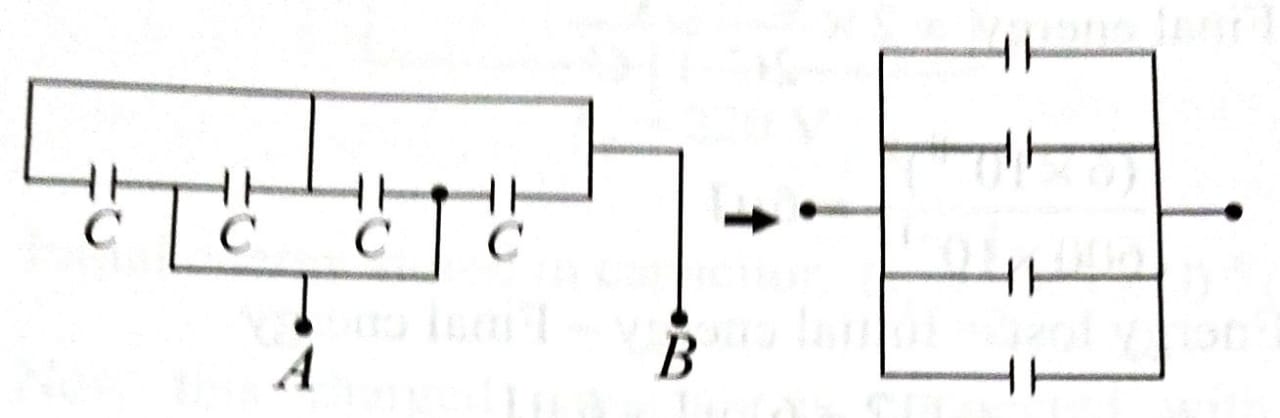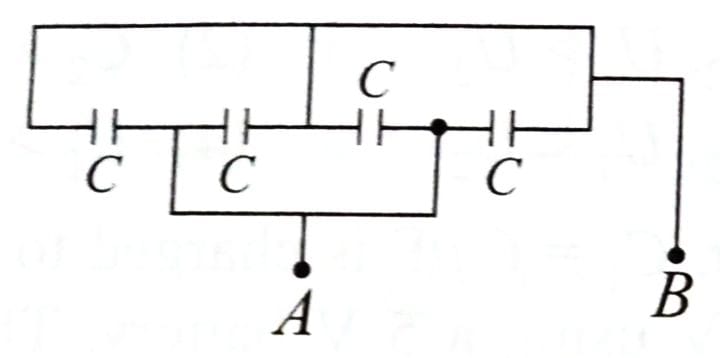 Four capacitors each of capacitance 16 F are connected as shown in the figure. The capacitance between points A and B is : ______ (in F). [2025]