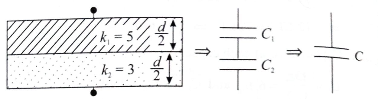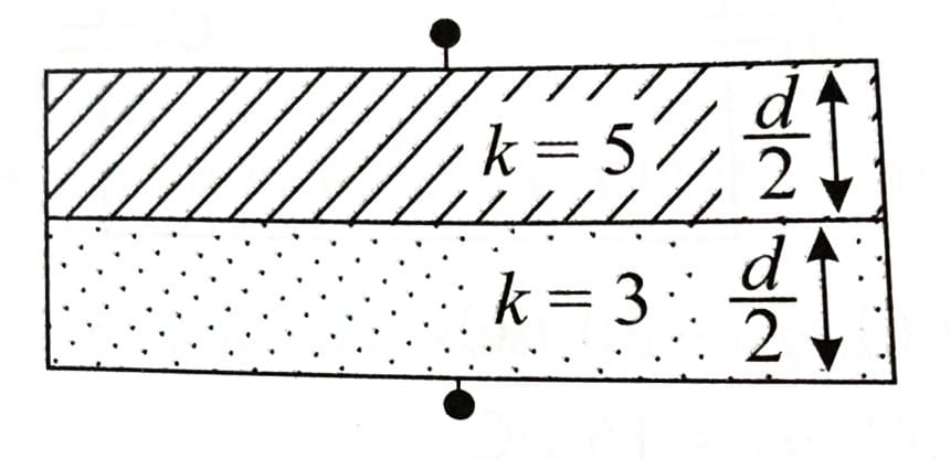Space between the plates of a parallel plate capacitor of plate area 4 and separation of (d) 1.77 mm, is filled with uniform dielectric materials with dielectric constants (3 and 5) as shown in figure. Another capacitor of capacitance 7.5 pF is connected in parallel with it. The effective capacitance of this combination is ______ pF. (Given ) [2025]