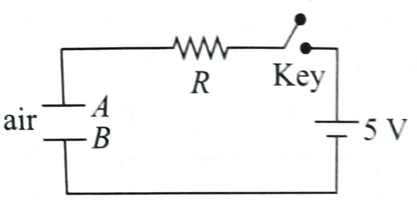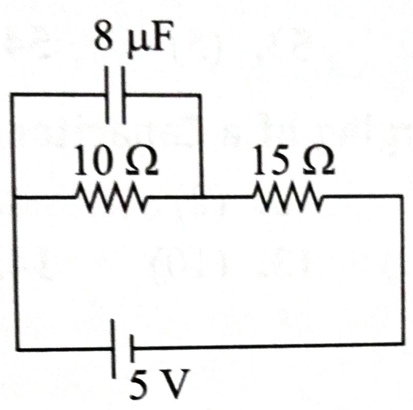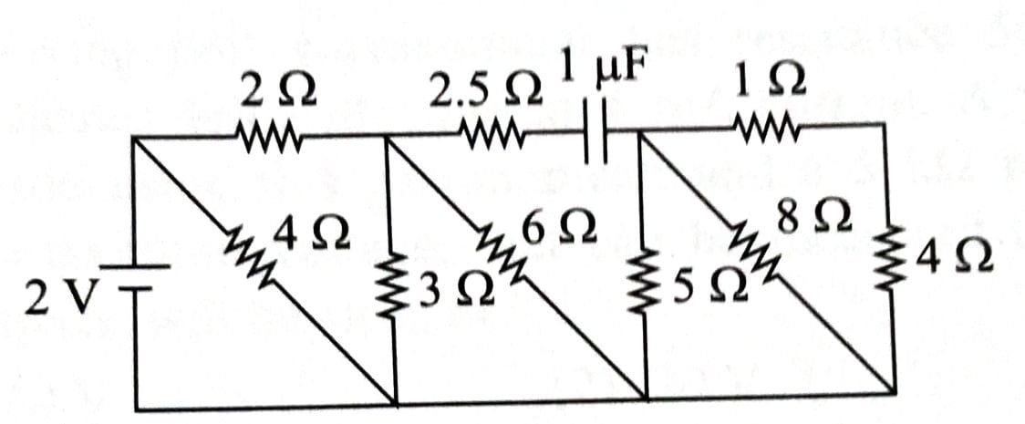 In an electrical circuit drawn below the amount of charge stored in the capacitor is ________ . [2024]