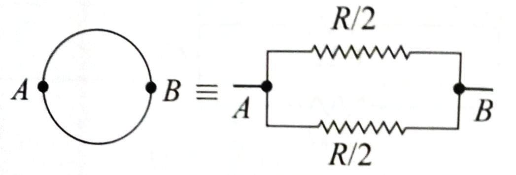 A wire of length 25 m and cross-sectional area 5 having resistivity of is bent into a complete circle. The resistance between diametrically opposite points will be [2025]