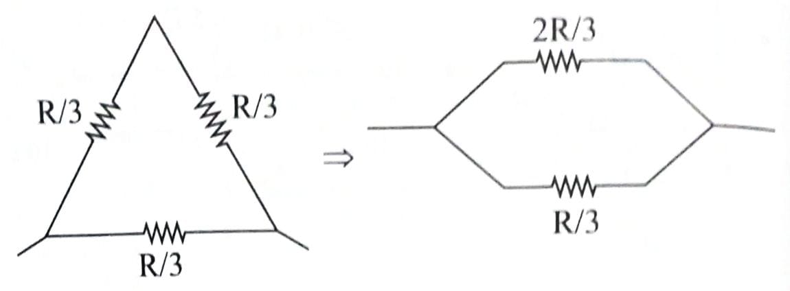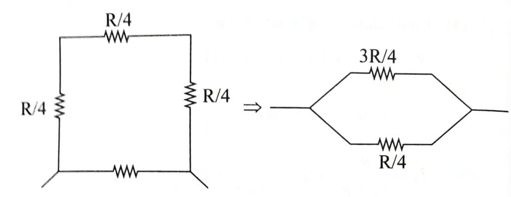 A wire of resistance R is bent into an equilateral triangle and an identical wire is bent into a square. The ratio of resistance between the two end points of an edge of the triangle to that of the square is [2025]