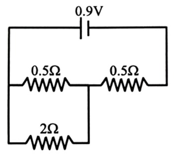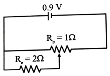 Sliding contact of a potentiometer is in the middle of the potentiometer wire having resistance as shown in the figure. An external resistance of is connected via the sliding contact. [2025]