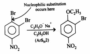 Electron withdrawing groups assist in nucleophilic substitution reactions for aromatic compounds. Because –M effect of – is operative at para position, from para position gets substituted.