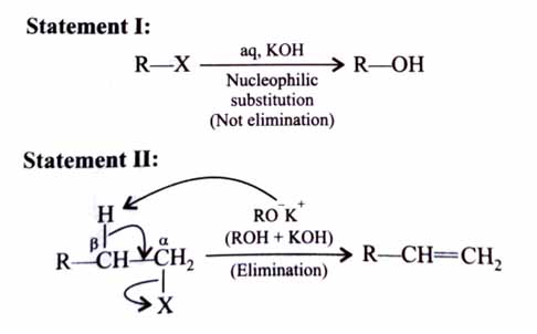 Statement (I): Alcohols are formed when alkyl chlorides are treated with aqueous potassium hydroxide by elimination reaction.