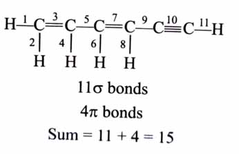 The sum of sigma and pi bonds in Hex-1,3-dien-5-yne is ______. [2025]