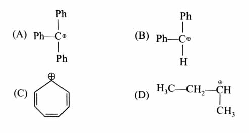 Carbocation formed by (4) is stabilized by +M effect of three Ph groups hence is most stable in the given options. Stability order of carbocations is: