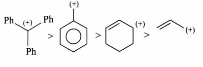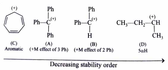 Stability of carbocations follows the order: 3° > 2° > 1°. This is due to more hyperconjugation and +I stability in higher degree carbocations.
