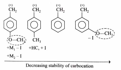 Electron donating groups increase stability of a carbocation. –OMe group can donate electrons by +M effect from ortho and para position. +M effect of –OMe dominates over its – effect. From meta position it withdraws electron density because of – effect. Electron donation by +M effect of –OMe is more than the electron donation by hyperconjugation and + effect of – group.