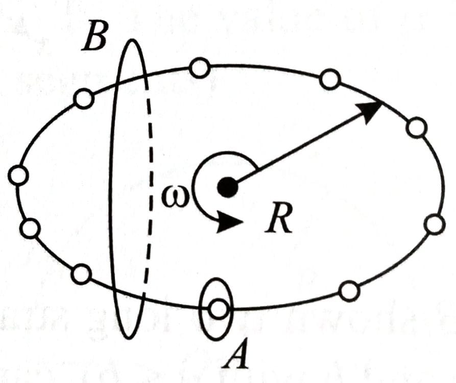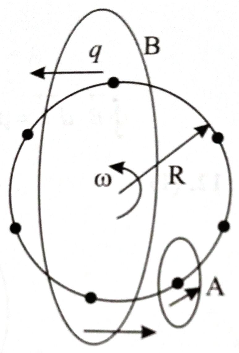 N equally spaced charges each of value q, are placed on a circle of radius R. The circle rotates about its axis with an angular velocity as shown in the figure. A bigger Amperian loop B encloses the whole circle where as a smaller Amperian loop A encloses a small segment. The difference between enclosed currents, , for the given Amperian loops is [2025]