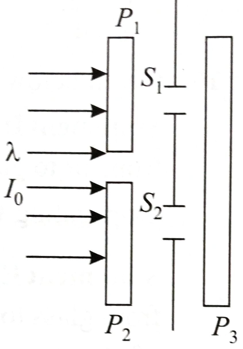 In a Young's double slit experiment, three polarizers are kept as shown in the figure. The transmission axes of and are orthogonal to each other. The polarizer covers both the slits with its transmission axis at 45° to those of and . An unpolarized light of wavelength and intensity is incident on and . The intensity at a point after where the path difference between the light waves from and is , is [2025]